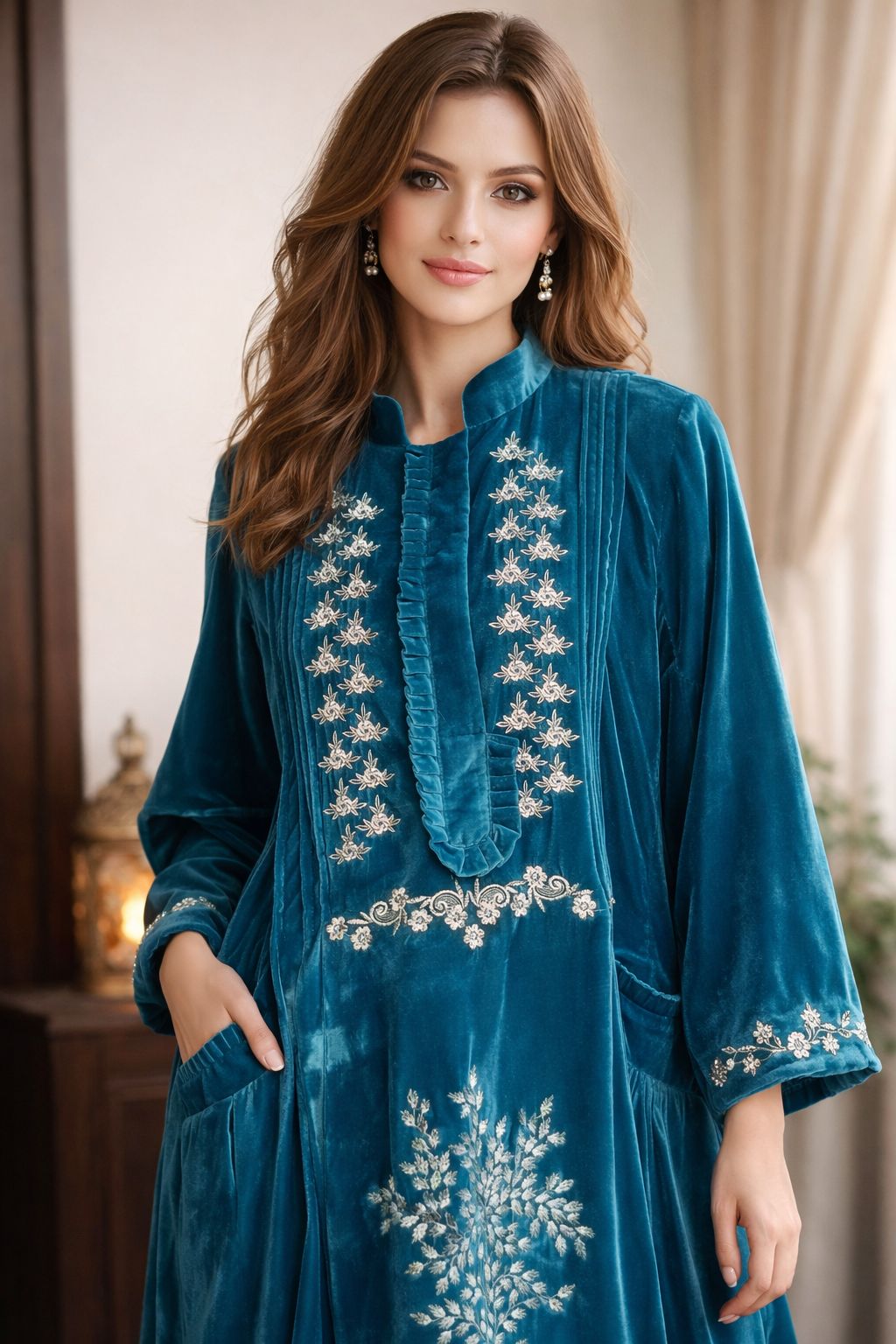 Luxurious velvet fabric with elegant embroidery, designed to deliver a rich and sophisticated look. The soft velvet texture offers a smooth, plush feel, while the detailed embroidery adds depth, elegance, and a high-end finish. Ideal for luxury garments, traditional wear, evening outfits, and decorative fashion applications.